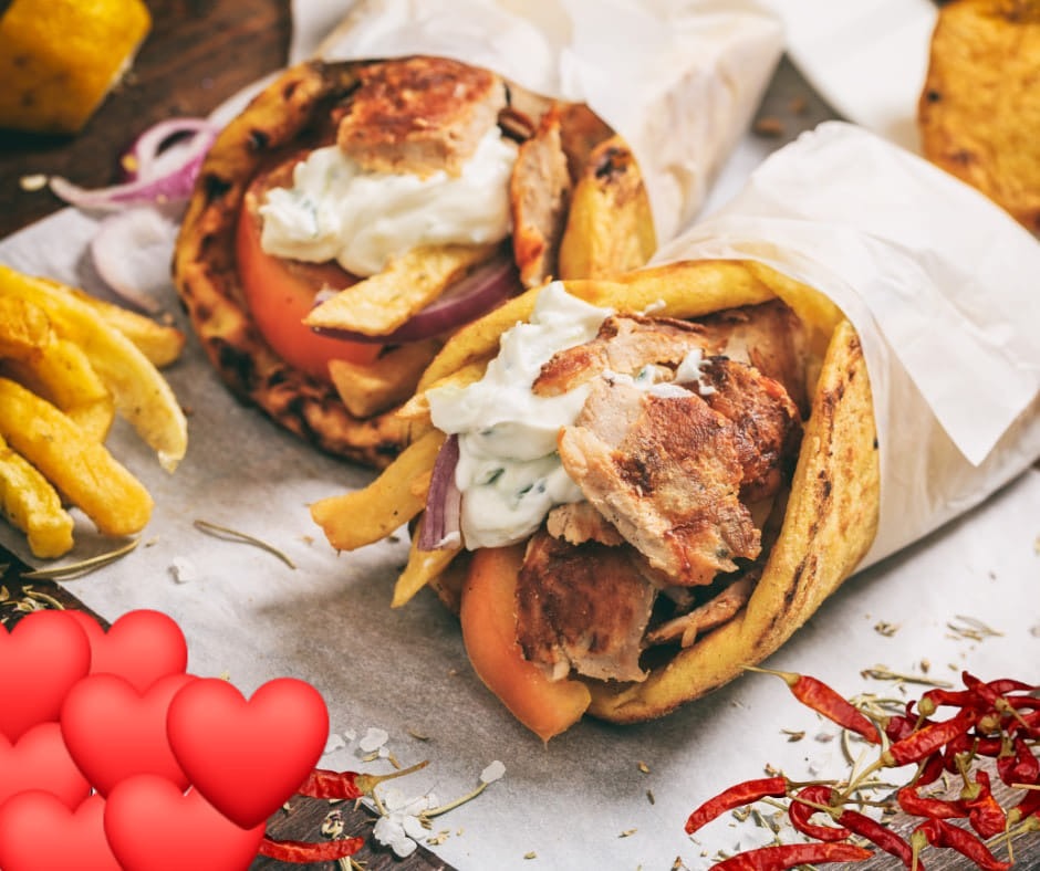 z frytkami, mięsem, mozzarellą, sałatą lodową, pomidorem, czerwoną cebulką, kukurydzą, serem feta i sosami -